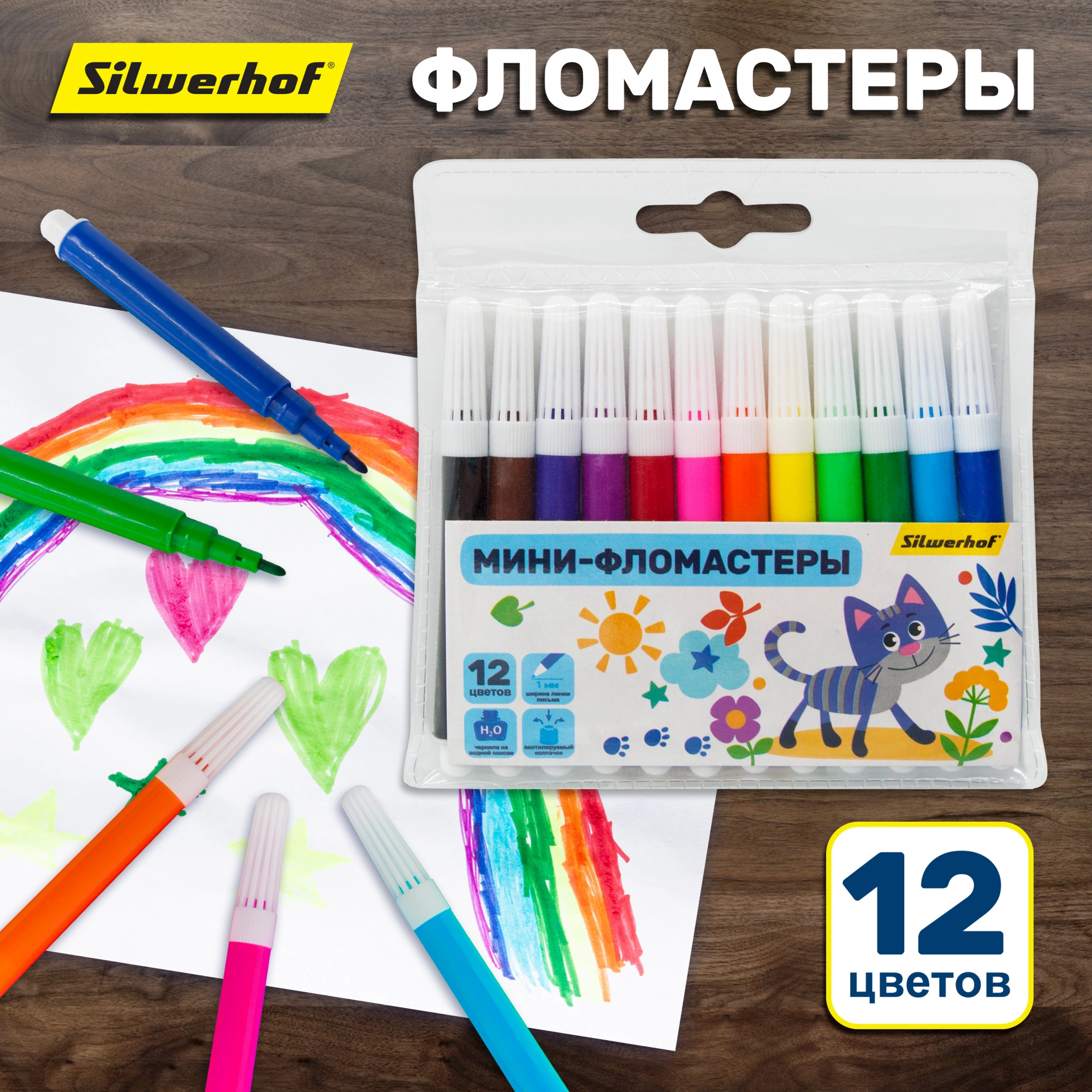 Фломастеры Silwerhof Веселые друзья 8мм 88мм круг. Вентилируемый 12цв. пакет с европодвесом (Кратно 12)