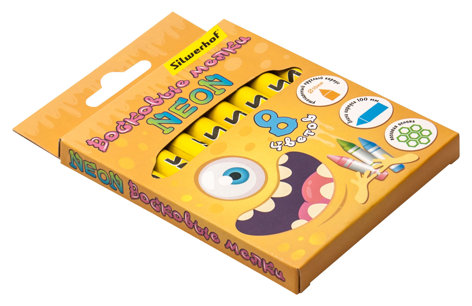 Восковые мелки Silwerhof Neon Монстрики 8цв. дл.100ммд.10мм картон.кор. (Только Упаковками 50)