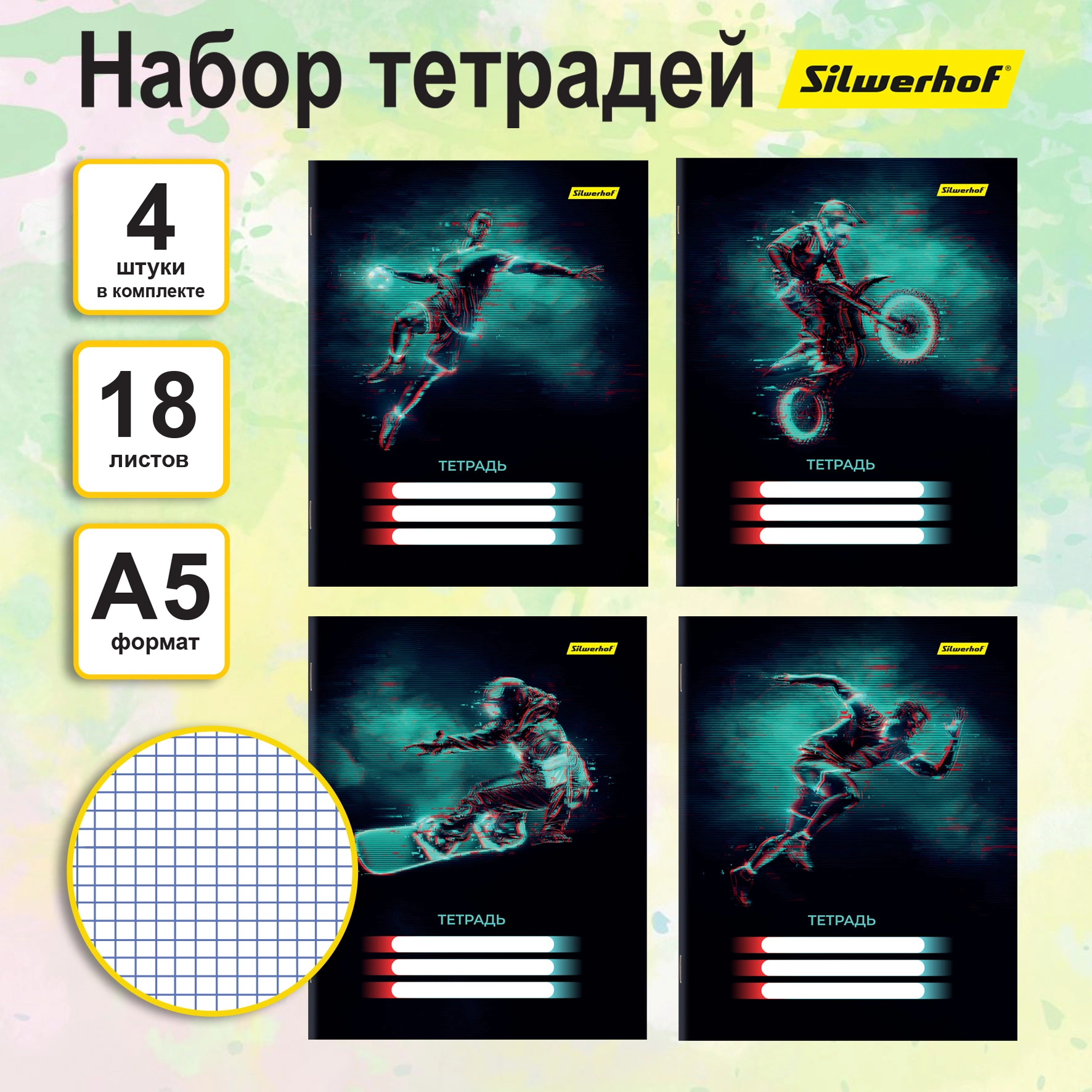Набор тетрадей Silwerhof 18л. клет. A5 Спорт 4диз. мел.карт. вод.лак скрепка (упак.:4шт) (Только Упаковками 50)