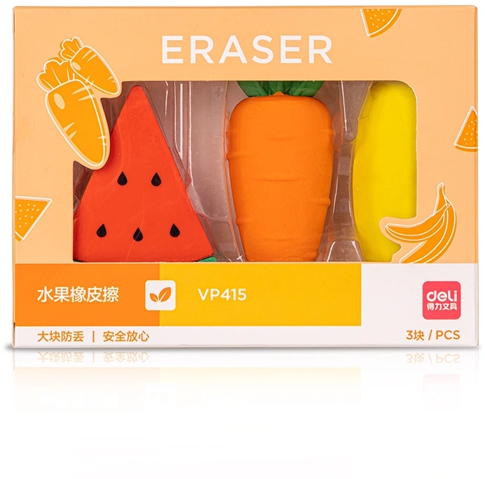 | Описание | Набор ластиков Deli в форме фруктов и овощей, 3 штуки, ТПР, картонная коробка |