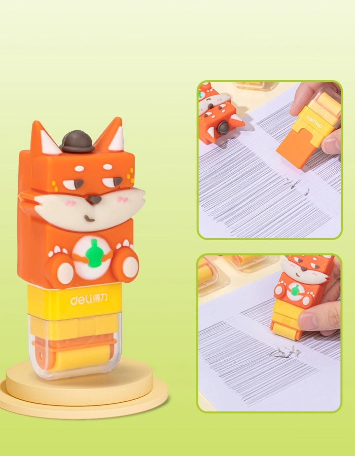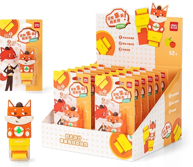 | Описание | Ластик Deli, ПВХ, 150х89х28 мм, в форме лисы, липкий ролик для удаления остатков ластика |