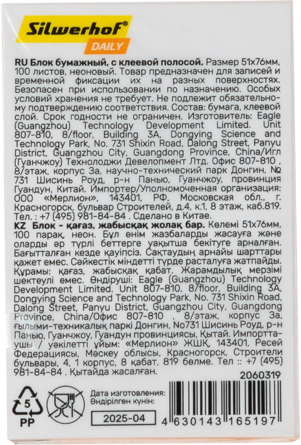 Блок самоклеящийся бумажный Silwerhof Daily 51x76мм 100лист. 75г/м2 неон оранжевый (Только Упаковками 12)