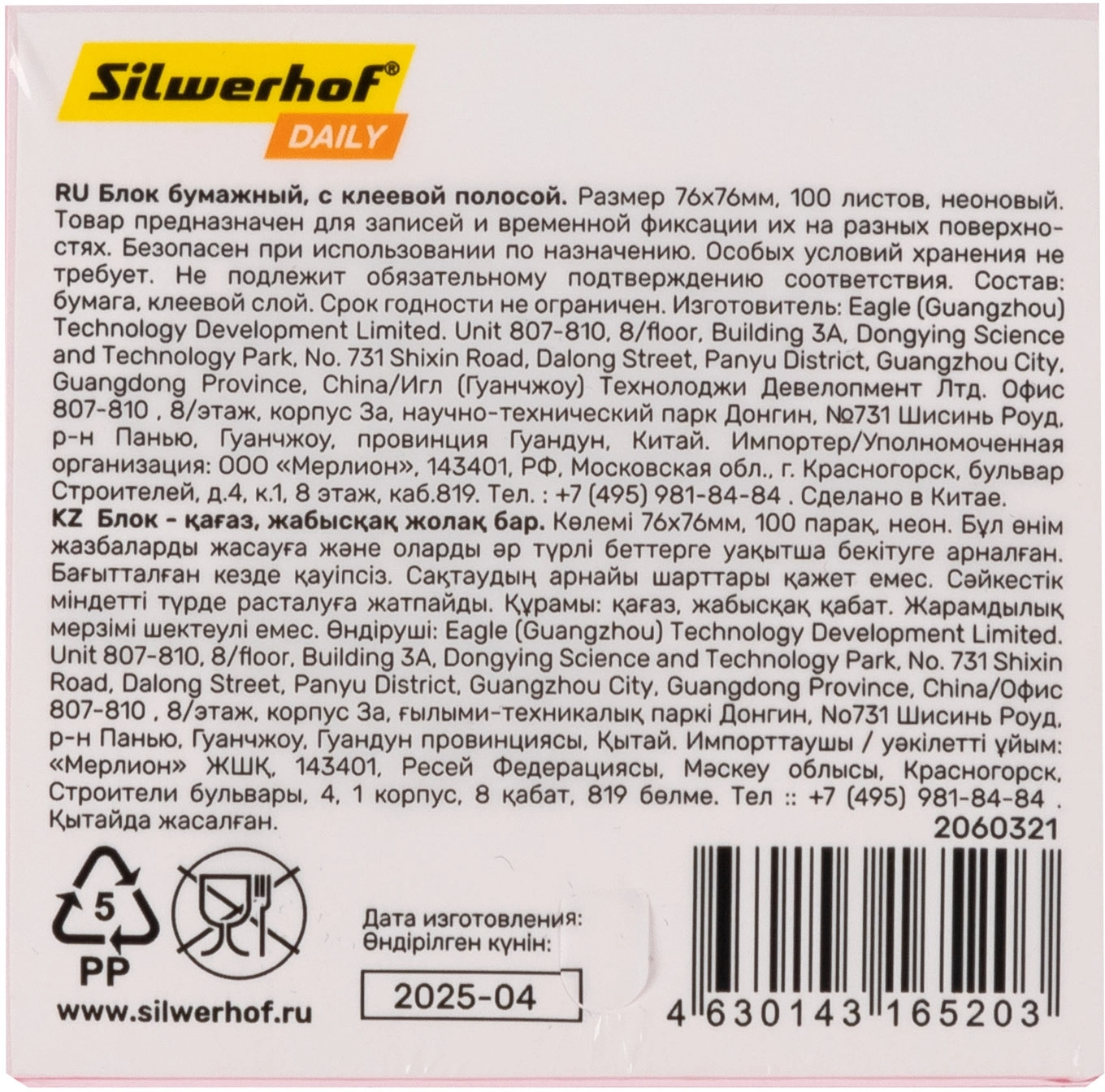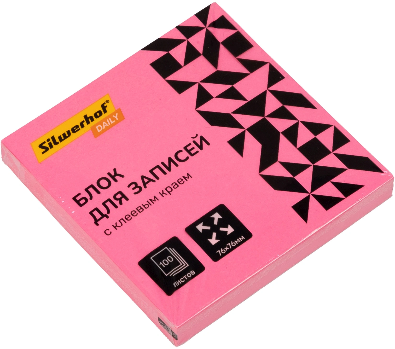 Блок самоклеящийся бумажный Silwerhof Daily 76x76мм 100лист. 75г/м2 неон розовый (Только Упаковками 12)