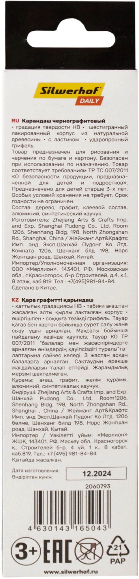 Карандаш ч/г Silwerhof Daily Basic 2мм HB шестигран. дерево коробка/европод. (12шт) ластик (Только Упаковками 12)