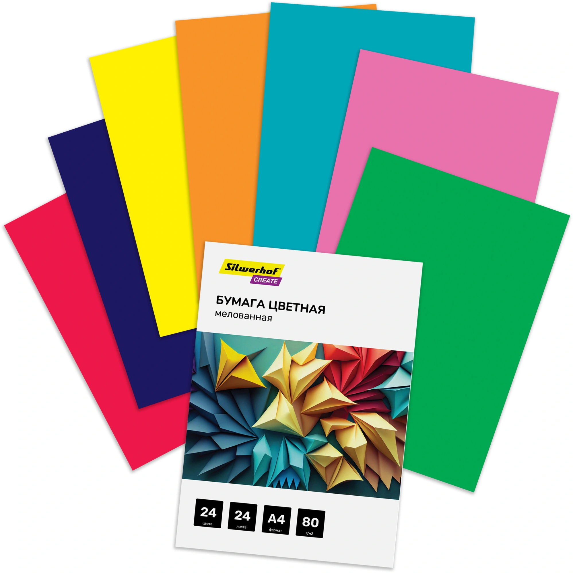 Бумага цветная Silwerhof мелов. 24л. 24цв. A4 Create 80г/м2 обл.мел.бумага ПЭТ на скобе (Только Упаковками 50)
