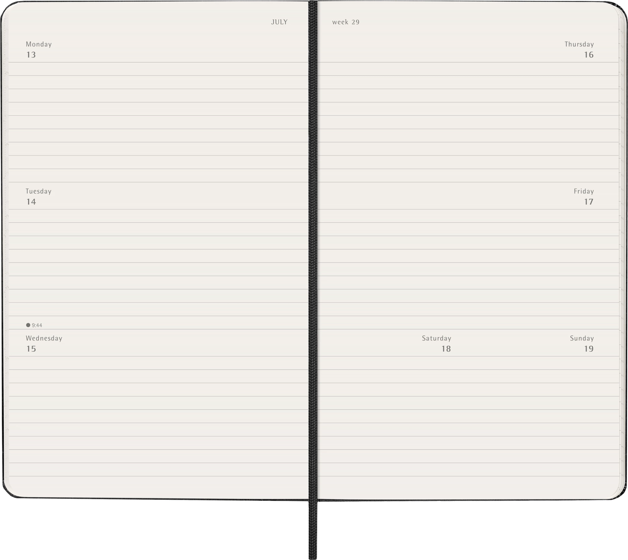 | Описание | В еженедельнике Moleskine формата LARGE каждая неделя представлена на двухстраничном развороте (понедельник, вторник и среда слева, а четверг, пятница и суббота с воскресеньем справа). Такой формат идеально подойдет тем, кто хочет иметь возможность оценить неделю с одного взгляда |
