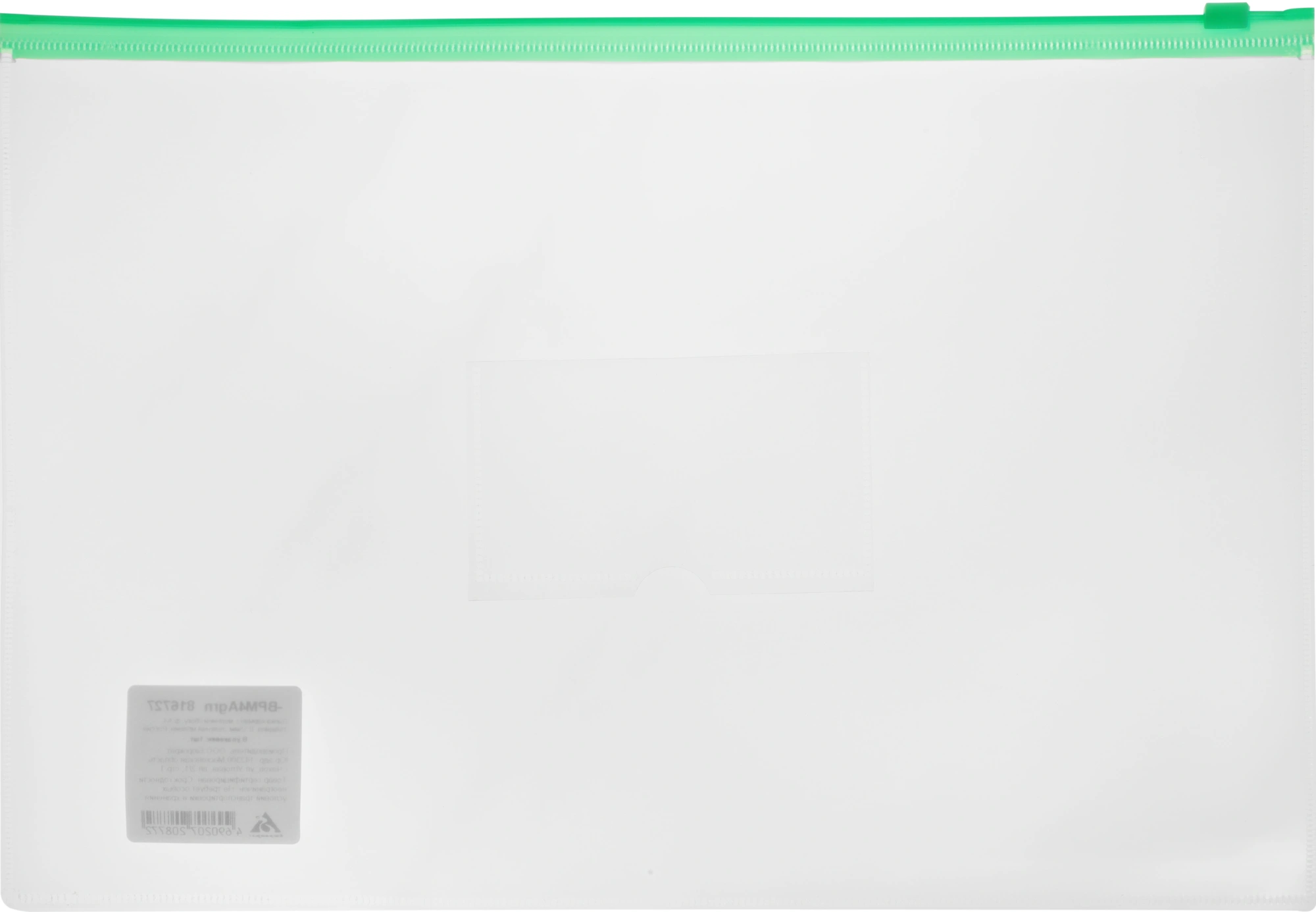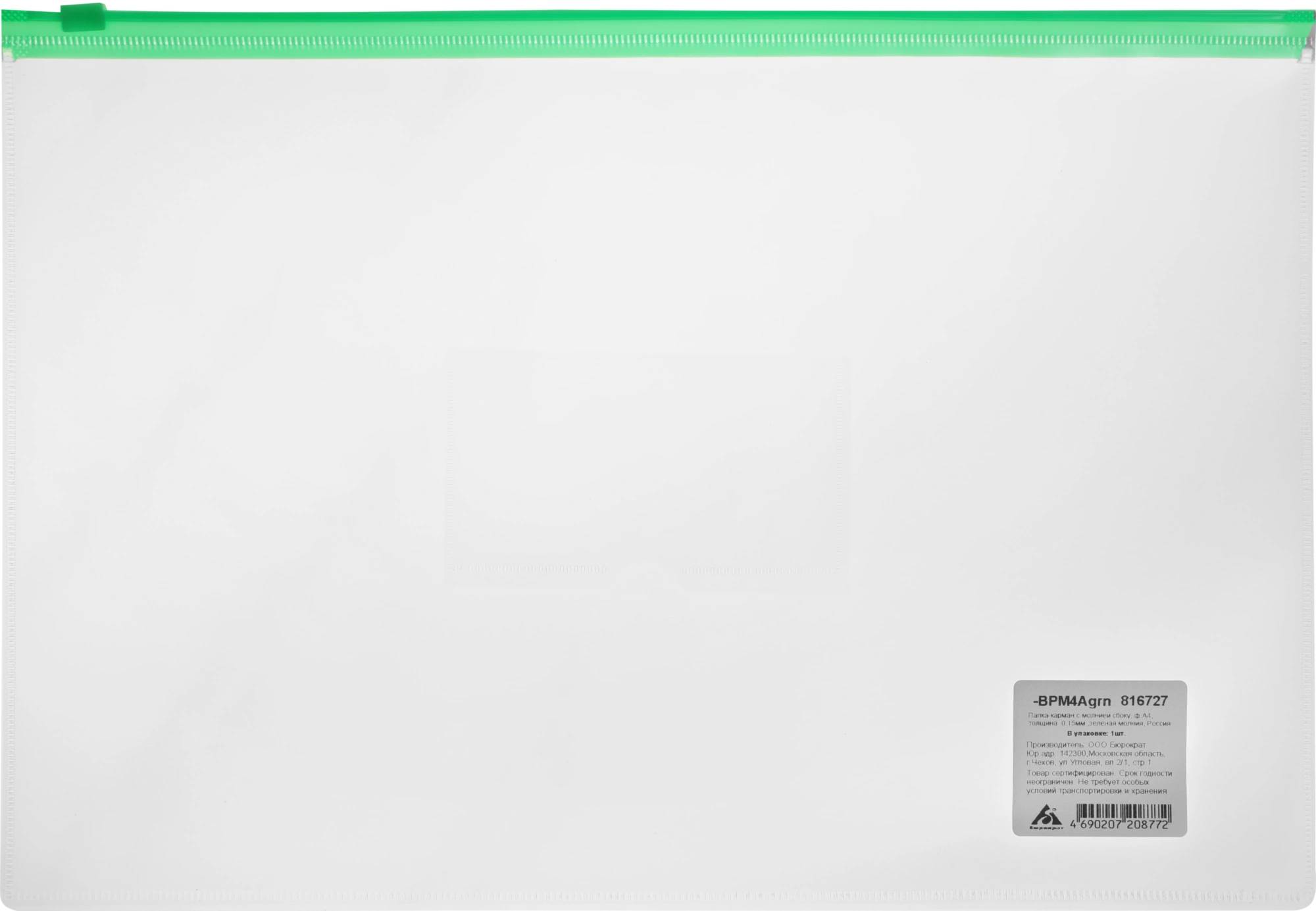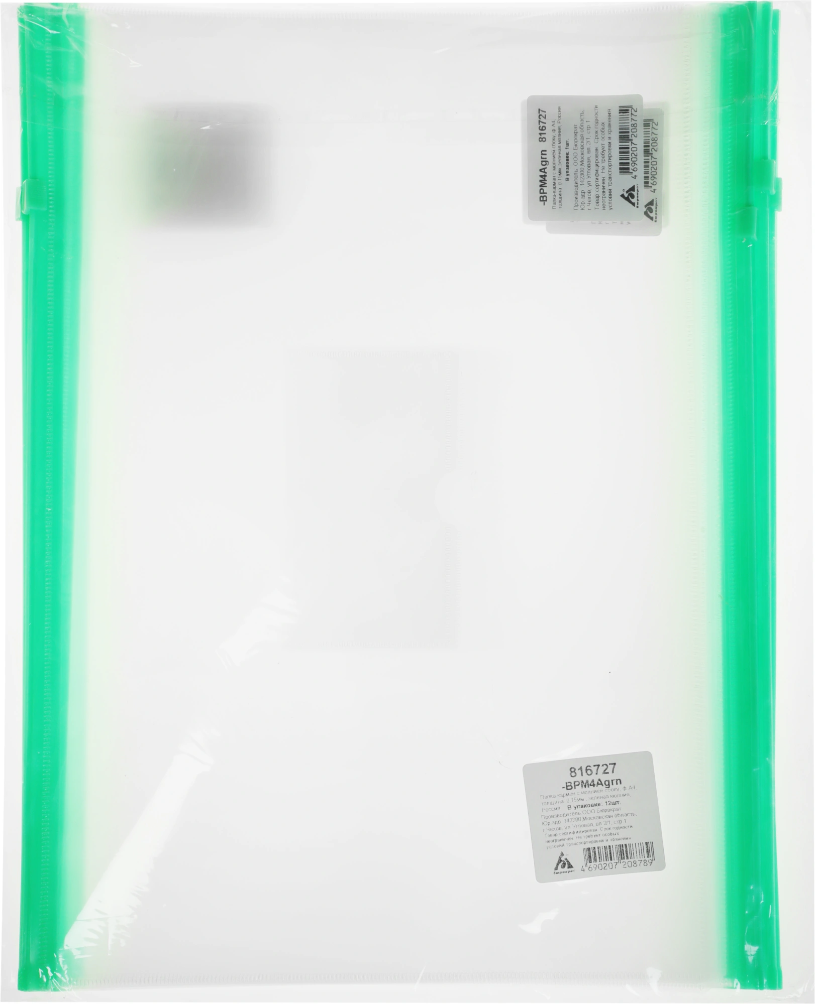 Папка на молнии ZIP Бюрократ -BPM4AGRN A4+ полипропилен 0.15мм карм.для визит. цвет молнии зеленый (Только Упаковками 12)