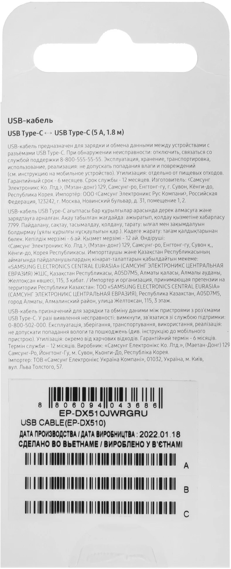 Кабель Samsung EP-DX510JWRGRU USB Type-C (m)-USB Type-C (m) 1.8м белый