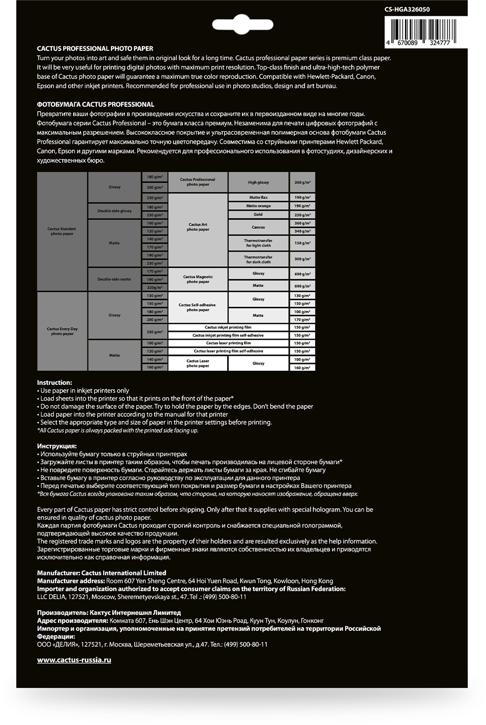 Фотобумага Cactus Prof CS-HGA326050 A3/260г/м2/50л./белый глянцевое для струйной печати