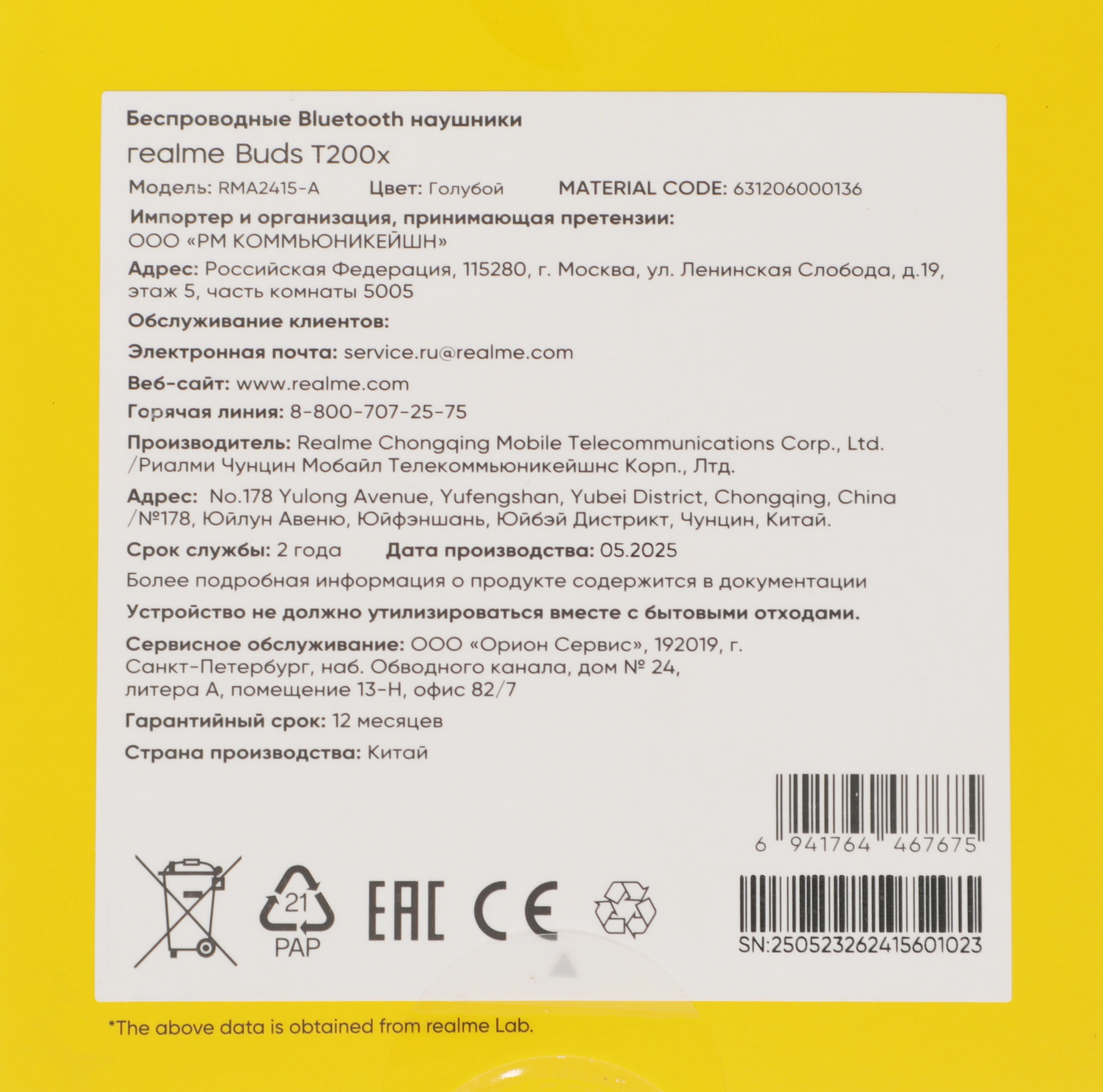 Гарнитура внутриканальные Realme Buds T200x синий беспроводные bluetooth в ушной раковине (6941764467675)