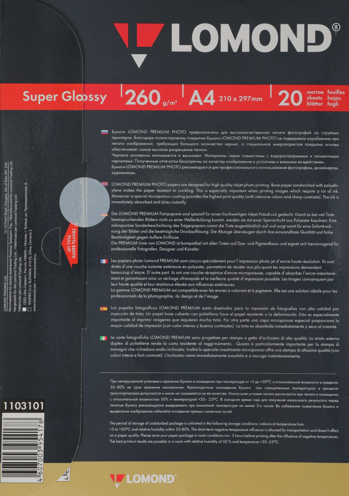 Фотобумага Lomond 1103101 A4/260г/м2/20л./белый высокоглянцевое для струйной печати