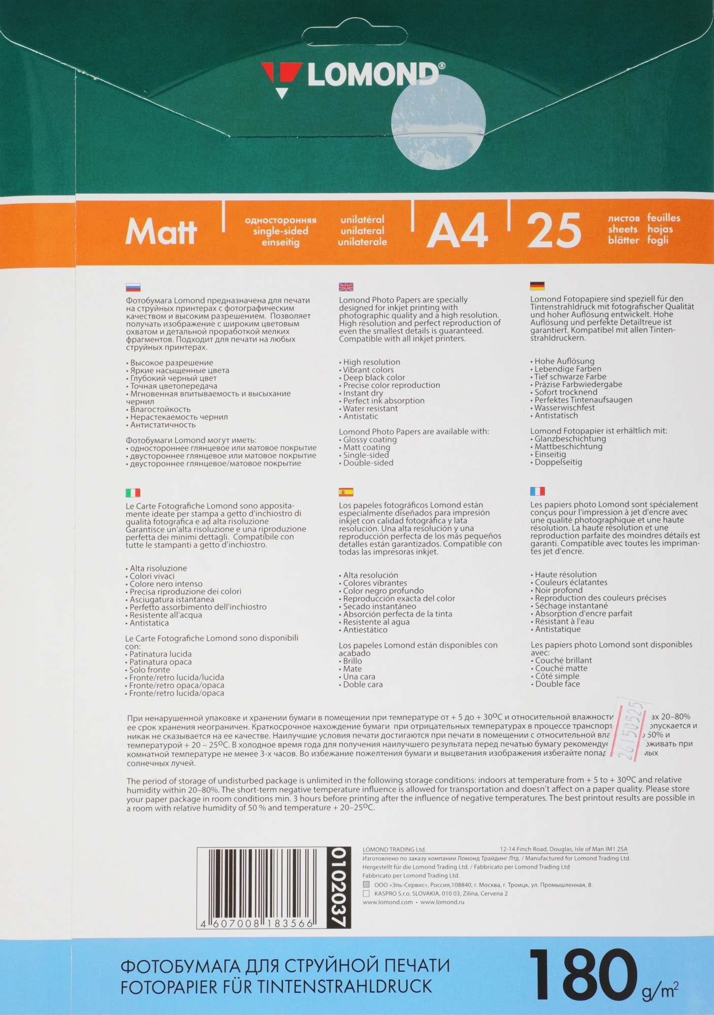 Фотобумага Lomond 0102037 A4/180г/м2/25л./белый матовое для струйной печати (Только Упаковками 35)